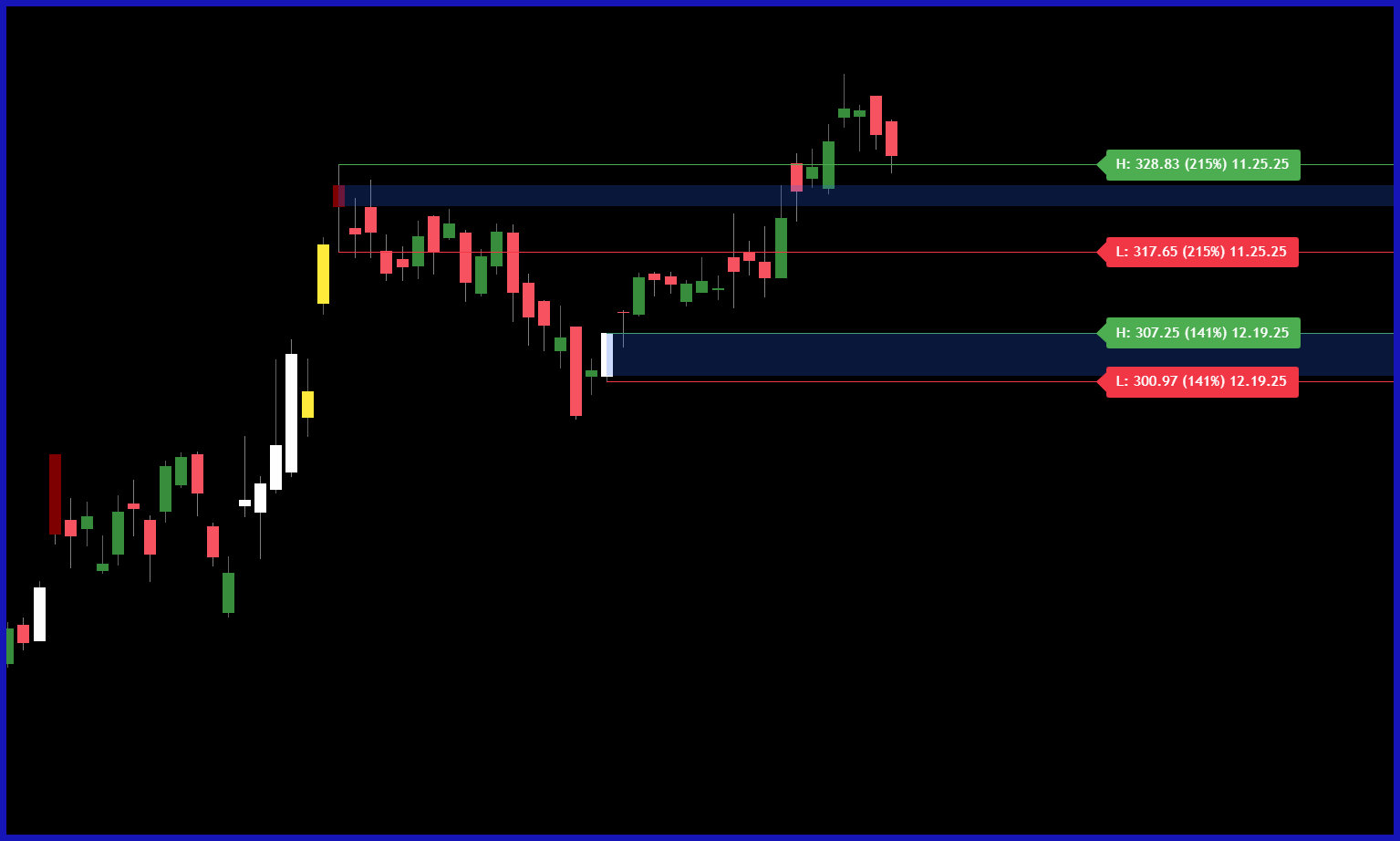 Auto-stagger system prevents overlapping labels on narrow-range candles by intelligently shifting text vertically. Display exact price levels, volume percentages (e.g., "H: 4505.25 (247%)"), and optional date stamps. Configurable threshold detection ensures labels remain readable even during consolidation periods.